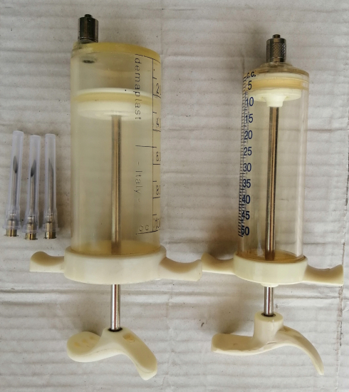 Vendo 2 siringhe per grossi animali da 100cc e 50cc più 3 aghi nuovi.