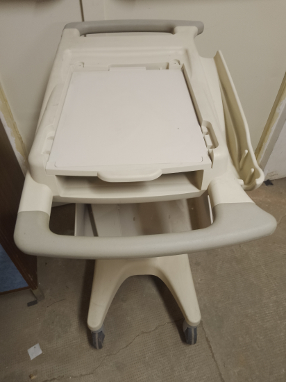 CARRELLO PORTASTRUMENTO ECG / ECOGRAFO PORTATILE, RUOTE CON FRENO, VASCHETTA CONTENITORE PORTATA 3 KG. RIPIANO PORTA STRUMENTO LEGGERMENTE INCLINATO, CON BARRA DI FERMO, cedo per cesata attivita'