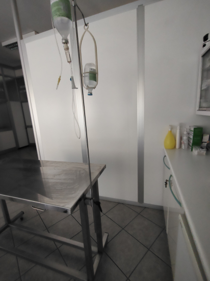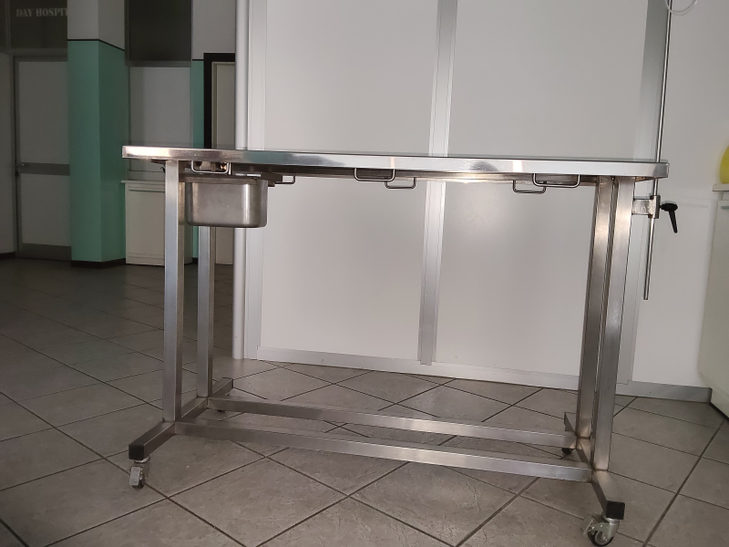 Prezzo: € 300Tavolo da Visita tutto in acciaio inox, gambe con ruote girevoli col freno. Trasformabile in barella con portaflebo estraibile. Vasca raccogli liquidi inox sottostante.
